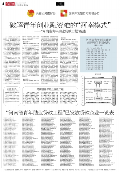 共青团河南省委(以下简称“团河南省委”)积极响应国家及省委、省政府支持中小企业发展、支持青年就业创业的号召,国家开发银行河南省分行(以下简称“国开行河南省分行”)努力践行增强国力、改善民生、先义后利的社会责任,双方密切合作,通过机制和模式创新,支持河南青年就业、创业事业的发展。