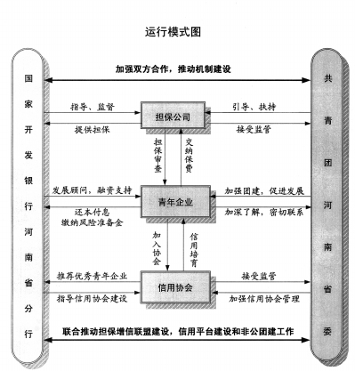 “河南省青年助业贷款工程”依托共青团的组织优势,运用国开行河南省分行规划与信用先行的社会化融资理念,推行“114合作模式”,即1组风险防范措施,1套激励约束机制,4个平台。重点面向青年创业企业,探索单笔额度300万元以下的批发化、标准化的小额贷款模式,破解青年创业中小企业融资难题。1组风险防范措施即:借款企业缴纳风险准备金、担保公司担保、贷款发放与偿还公示、联合监督检查等;1套激励约束机制即:贷款利率、合作额度、担保保证金比例调整及团组织的表彰评比等;4个平台,即以“河南省青年创业服务中心”为合作平台,以共青团河南省委所属信用协会为信用培育平台,以市场化运作的担保公司组成担保增信联盟为担保平台,以河南省青年助业贷款工程网为项目收集和公示平台。