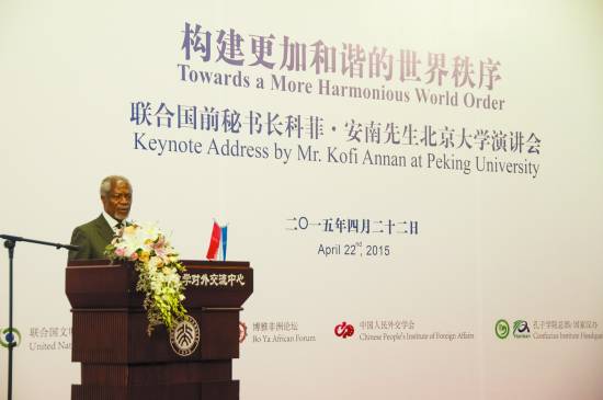 4月21日、22日,作为科菲·安南基金会的主席,安南到访北京大学,被聘为北大“大学堂”顶尖学者讲学计划学者(Peking University Global Fellowship),与北大学者和学生座谈,并发表了以“构建更加和谐的世界秩序”为题的演讲。即便已不再亲自斡旋于风云际会的国际舞台,但安南有关国际秩序、中国和青年议题的见解,依然吸引了“挤满一屋子”的学者和青年学子侧耳聆听。
