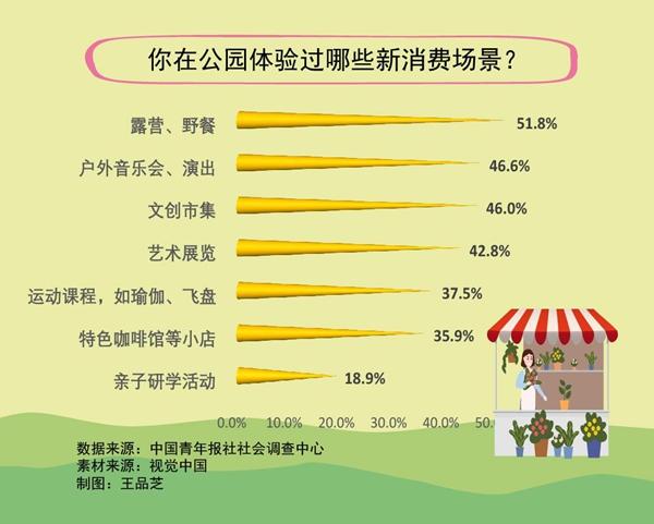 春天到了,鲜花盛开的公园成为热门打卡点。大家在逛公园的同时还参与到露营、文创市集等消费场景中。近日,中国青年报社社会调查中心联合问卷网(wenjuan.com),对1342名受访者进行的一项调查显示,露营、野餐(51.8%),户外音乐会、演出(46.6%),文创市集(46.0%)是大家逛公园时体验较多的消费场景。