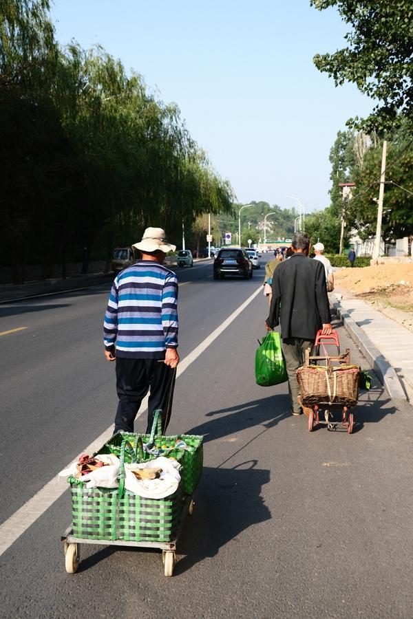 曹文坤会乘坐中午的车赶回家,给梨树和豆角浇水,它们是下个季度小孙子的学费。曹文坤是退伍军人,儿子在济南卖冰柜。他住不惯楼房,又回村操持农活儿。50年前,他是铁道兵,负责建造运输物资的火车站,背着镐头和锤子、看着火车进站。50年后,他挑着山货,看着公交车进站,“还是闲不住”。