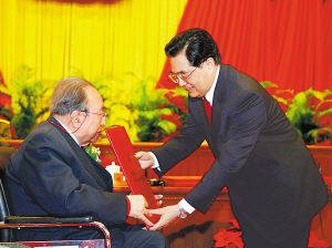 胡锦涛向获得2007年度国家最高科学技术奖的中国科学院院士吴征镒颁奖。新华社记者马占成摄