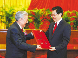 胡锦涛向获得2007年度国家最高科学技术奖的中国科学院院士、中国工程院院士闵恩泽颁奖。新华社记者鞠鹏摄