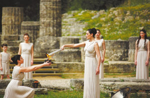 3月23日,扮演最高女祭司的玛利亚·娜芙普利都(前右)在彩排仪式上用火炬点燃火种罐。当日,北京奥运会圣火采集仪式在奥林匹亚进行最后一次彩排。新华社记者毕明明摄