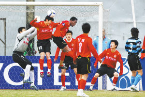 照片:4月9日,长春亚泰队在亚冠联赛中,主场以1∶0战胜韩国浦项制铁队。图为亚泰队员门前解围。北风摄