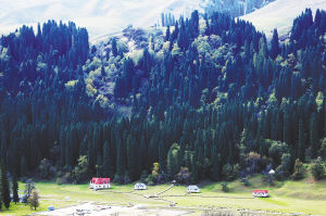 库尔德宁在哈萨克语中为“横沟”之意,是一条南北走向的阔谷,长约14公里,最宽处约1公里,平均海拔1500米,四季气候宜人。