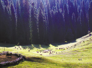 离开阿努尔汗一家我们继续往上走,来到了一个更高的山岗。这里可以看到远方的雪山和一排排笔直高大的云杉。这云杉据说是新疆独有,与雪山、溪流和草原,共同构成辽阔、壮美的画卷。