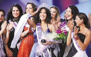 秘鲁旅游小姐SilviaVanessa(中)获得本年度国际旅游小姐冠军。浙江传媒大学一年级学生童鹤获亚军。本报记者刘占坤摄