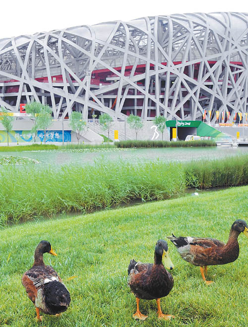 7月29日,三只鸭子在国家体育场“鸟巢”外边觅食。目前,坐落在绿草、花团和流水之中的“鸟巢”已经按照“绿色奥运”的要求准备就绪,静待各国朋友,在8月8日晚一起见证北京奥运会的盛大开幕。
