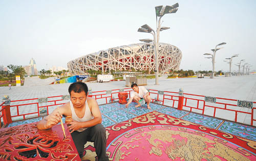 7月29日,两名工作人员在奥运村中心区进行彩绘创作。当日,距北京奥运会开幕还有10天,奥运村中心区内一片忙碌的景象。
