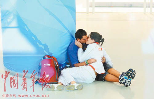 西班牙一位女运动员与男友在水立方。