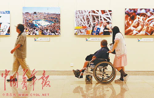 一位残疾人在中国美术馆观看北京奥运会新闻图片展。