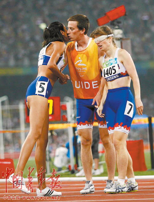 9月8日,国家体育场“鸟巢”,在女子800米—T13/12 比赛结束后,一位运动员亲吻她的领跑员,表示感谢。