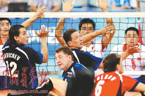 9月8日,俄罗斯和中国队员在坐地男子排球赛场上激战,俄罗斯队最终以3:0完胜中国队。