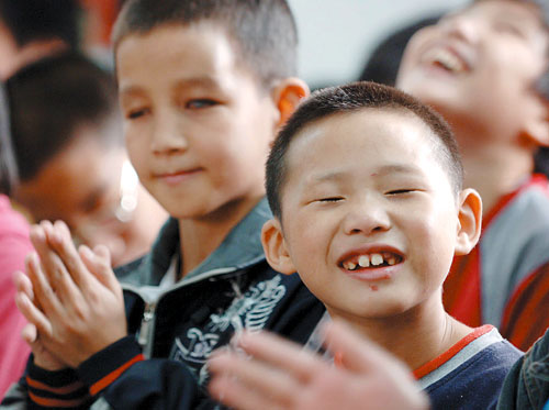 10月15日,重庆市盲人学校的盲童用“听”来感受联欢会现场的热闹气氛。当日是第25个国际盲人节,重庆市工商大学旅游学院义工志愿者协会的30多名大学生志愿者来到重庆市盲人学校,和数百名盲人学生一起自编自导了一台精彩的文艺联欢会,让盲人学校的学生们度过了一个快乐的盲人节。