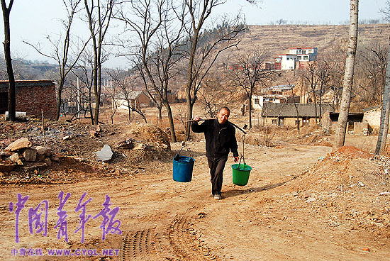 照片:河南登封石道乡重旱山村张沟村,57岁的村民申鸟正从山沟里的水井中挑水回家。本报记者 韩俊杰摄