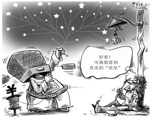 陕西省宝鸡市凤县山上,安装3300余盏太阳能星星灯和一个5平方米的LED月亮屏。这一“人造星星”工程引起争议后,凤县旅游局负责人称,星星灯采用太阳能技术,一次性投资只需210万元,却可节约电费。(中新网4月6日) 漫画:徐简