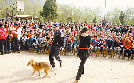 合武铁路安全宣传小分队的年轻干警吕芳芳在梅山镇三湾小学教学楼前的临时场地上为师生演出拉丁舞时,一条狗冲上了舞台,一旁的干警迅速将狗赶开。这支由合肥、上海、南京、杭州等地铁路公安处抽调的演出小分队将用一个月时间为铁路沿线群众宣传安全常识。