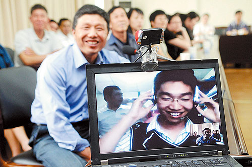 5月19日下午,在四川地震灾区的医务人员赵苗华通过视频看到父亲后开心不已。当日,浙江省余姚市卫生局举行了一场网络视频见面会,余姚市第五批15位赴四川青川县地震灾区的医务人员通过一条细细的“亲情线”与家属进行了网络视频“见面”。陈斌荣摄(新华社发)