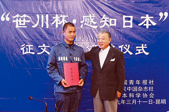 2008年,由中国青年报社、日本科学协会、人民中国杂志社共同发起的“笹川杯·感知日本”有奖征文大赛取得圆满成功,不仅有8位获奖者顺利赴日本进行了参观和交流活动,而且还演绎了日本财团会长笹川阳平前往云南监狱为征文获奖者颁奖的一段佳话。今年,上述三家单位再次携手,共同举办“2009笹川杯·感知日本”有奖征文大赛,本届大赛是2008年“笹川杯”征文赛事的延续。