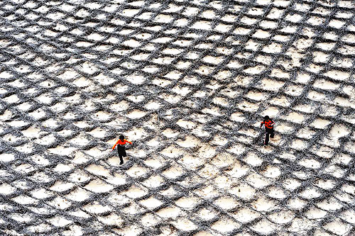 2009年4月18日,两名小朋友在宁夏毛乌素沙地边缘的草方格里玩耍(资料照片)。6月17日是“世界防治荒漠化和干旱日”。近年来,我国将防治土地荒漠化、保护生态环境作为国家可持续发展的重要内容,经过长期努力,目前荒漠化和沙化面积实现双减。 新华社发