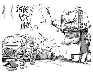 6月30日零时起,我国汽、柴油价格每吨平均提价600元,这是今年以来,国内成品油价调整幅度最高的一次。此前,油价已三次上调。漫画:徐简