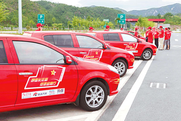 6月28日下午,在《十送红军》的歌声中,金刚2代长征车队缓缓驶出吉利台州路桥工厂的大门,踏上了漫漫长征路。车队包括3辆金刚2代、3辆金鹰,还有3辆远景工作车。车身上下耀眼的红色,引来行人驻足观望。