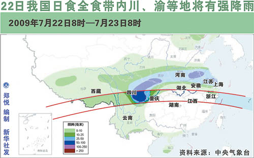 这次日全食在我国陆地范围内共持续40多分钟。日全食带经过我国的西藏、云南、四川、重庆、湖北、湖南、安徽、河南、江西、江苏、浙江和上海,共12个省、自治区或直辖市。日全食带经过人口稠密的长江中下游地区,成都、重庆、武汉、合肥、杭州、苏州和上海等几个大中城市均可见全食。