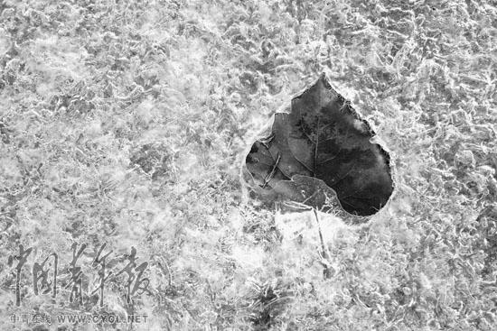 冬日里,一片枯叶,穿破坚冰。枯叶是柔弱的,原本不堪一击,有何能耐将坚冰“降服”。仔细分析,原来枯叶的深色吸收太阳热能,把覆盖在之上的冰层渐渐融化。这大概就是上天赐予弱者的力量吧。