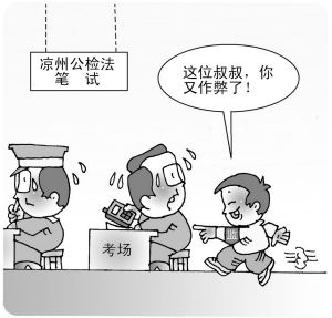 7月26日,甘肃武威凉州区在全区公检法系统竞职笔试中,突破常规思维,聘请18名少先队员担当“监考官”,收到了意想不到的效果。小学生“秉公执法”,当场抓住25名作弊考生。(《兰州晨报》7月30日)漫画:陆贞琴