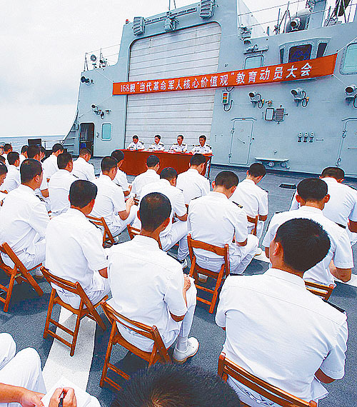 海军官兵在印度洋上进行当代革命军人核心价值观教育。查春明摄