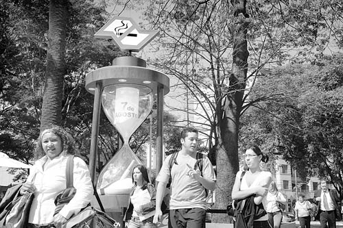 8月6日,在巴西圣保罗,行人走过一个象征禁烟令倒计时的沙漏。圣保罗州的新禁烟令从8月7日开始实施,除了在户外和私人住宅,其他场所都将禁止吸烟。