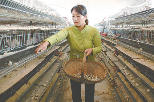 河南省南阳市卧龙区王村乡大学生村官刘亚丽去年任职后,通过小额贷款投资5万余元建起了投资小、见效快、易推广的鹌鹑养殖基地。在她的示范带动下,王村乡已有20多户农家留守妇女从事鹌鹑养殖业。