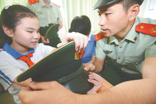 “这里是麦穗,这里是天安门,这里是五角星。”日前,广东边防七支队二十二中队官兵走进深圳市元平特殊学校交流,让该校失明儿童触摸警徽。