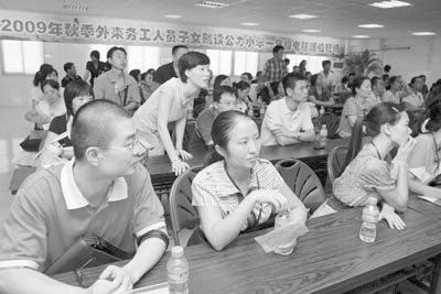 2009年8月26日,福建省厦门市,2009年秋季外来务工人员子女就读公办小学派位现场,家长焦急地看着派位结果。厦门市思明区和湖里区举行秋季公办小学一年级招收进城务工人员子女入学的电脑派位。两区共计有3142名进城务工人员子女被派入公办小学。
