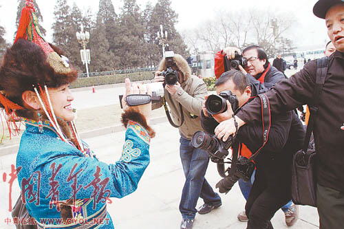 3月7日下午,全国政协十一届三次会议在北京人民大会堂举行第二次全体会议。妇女节将至,全国政协委员、来自青海省海西州乌兰县蒙医医院的菊红花备受摄影记者的关注,她也举起手中DV对着记者们拍摄。