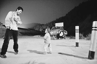 2010年3月17日,深圳,一名来自安徽的防水工放工回家后,带孩子玩耍休息。尽管全家人都蜗居在前后不到5平方米的三轮车上,但他们认为,有技术,开着“房车”去哪里都不怕。