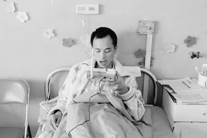 2010年4月9日,河津铝厂医院,王家岭获救矿工与家属见面。图为28岁的矿工史风雷正给亲人打电话。山青摄