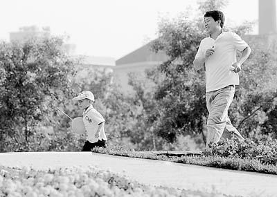 沈阳街头,年轻的父亲和儿子在玩耍。
