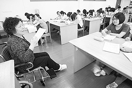 6月12日,浙江宁波效实中学特级教师张弛,腿部受伤后坚持坐轮椅给学生上课。张培坚摄(资料图片)