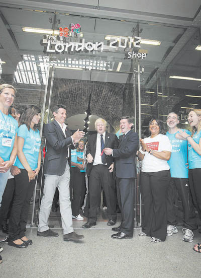 7月27日,在英国伦敦,伦敦市长鲍里斯·约翰逊(中)、伦敦奥组委主席塞巴斯蒂安·科(左)和英国体育与奥运大臣休·罗伯逊,为首家伦敦奥运商品旗舰店剪彩。当日,在伦敦奥运会倒计时两周年之际,伦敦开始全民总动员。