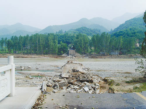 原来230多米的大桥,现在只剩下了两边的桥头。桥身全部垮到了洪水中,随之而去的,还有数十个鲜活的生命。