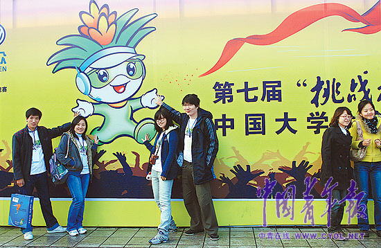 参赛同学纷纷在“挑战杯”吉祥物前合影留念。本报记者 赵青摄