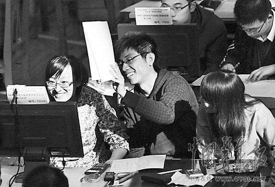 9月26日,在网络虚拟运营的比赛中,一名参赛选手为队友遮挡窗外照射来的太阳光,协助她进行网上操作。本报记者 赵青摄