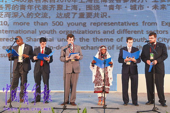 10月29日,2010年上海世博会青年高峰论坛举行,世界各大洲青年代表一起宣读2010上海世博青年倡议书。 本报记者 李建泉摄