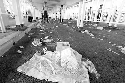 今年6月14日,端午小长假第一天,由于一些参观者缺乏自律,将垃圾随地乱扔,上海世博园沙特馆排队区内一片狼藉。