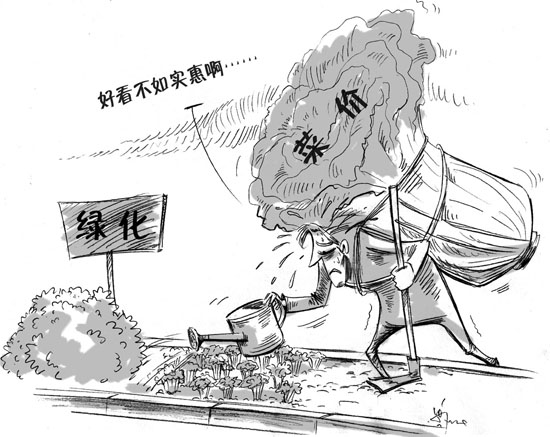 海南琼海市人民路两旁的一段绿化带近日成为一些市民的菜园子,里面被种上叶菜、豆角、地瓜等作物。种菜的市民说,眼下菜价涨得厉害,他们只好自力更生自给自足。(《华西都市报》11月10日)漫画:徐简