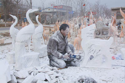 一家主要经营名人塑像的工厂里,厂长卢少凯站在一米多高的架子上正忙活,“面部雕刻是我最擅长的部分,在工人完成其他部分之后,我都要求把脸部留着,由我亲自来刻。”卢少凯介绍:“以前也卖维纳斯之类的西方雕塑,金融危机后出口就少了。国内还是买名人像的比较多,毛主席像最好卖,平均每个月都能卖两个,主要是学校、政府机关、公园跟我们订货。汉白玉、花岗岩的都有,最大的6米高,卖30多万元;最小的80厘米,卖1万多元。冬天买的人少,但我们也会做一些,来年春天都能卖出去。”