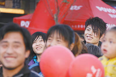 11月24日,泥塑厂学徒吕小帅和张少鹏在庙会上观看表演。