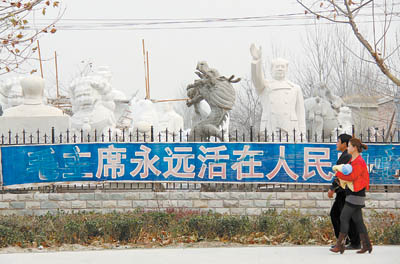 在曲阳县城南的“雕刻工业园区”,路两旁摆满了大型雕塑。毛泽东、耶稣、孔子、马克思、莫扎特、龙凤、狮子、自由女神、貔貅、圣母等雕像混搭在一起。